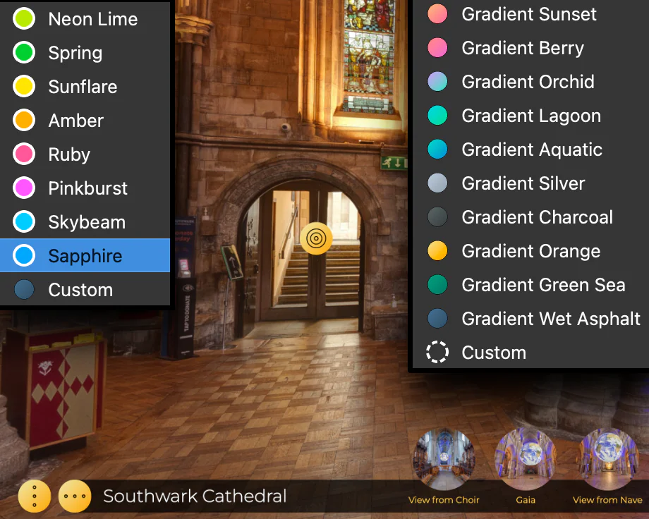 В Pano2VR 8 появился новый стандартный скин Quaranta — универсальный, с чистой графикой. Он включает навигационные стрелки с превью изображениями и меню миниатюр. Особенность скина Quaranta — наличие светлой и тёмной темы, а также возможность выбора формы иконок.