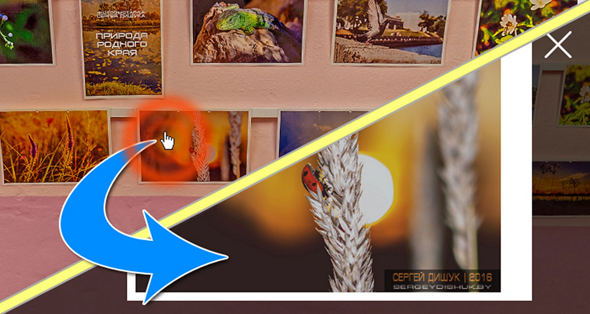 Кликабельностью я называю свойством объекта реагировать на нажатие кнопок мыши. В роли таких объектов могут выступать картины на стене, двери, окна, приборы воспроизведения аудио/видео и т.д. В рамках этой статьи будет рассматриваться алгоритм наделения объектов панорамы свойством кликабельности. В качестве примера взята панорама моей фотовыставки, на которой можно не только посмотреть фотографии на стене, но и увидеть сами фотографии, нажав на любую из них на стене.