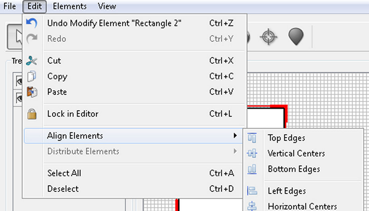 Когда возникает необходимость выровнять несколько элементов по одной из границ или их центрам можно задать воспользоваться меню Align Elements (Выравнивание элементов) (рис. 2) и выбрать нужный пункт подменю. Перед этим необходимо в поле редактора выделить два и более элемента. Также следует учесть, что элементом, задающим границу или центр выравнивания, является активный элемент – выделен красной рамкой с жирными углами.