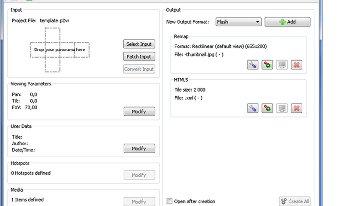 Перед тем, как приступать к работе со средствами оптимизации, создадим шаблон проекта. В моем проекте панорама будет экспортироваться в формат HTML5. Кроме этого будет создаваться файл изображения превью. По этому шаблону будут создаваться несколько панорам.