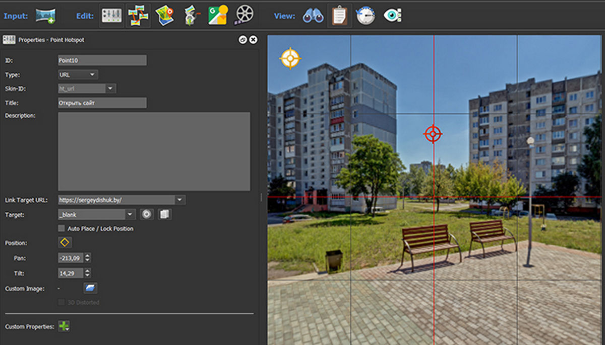 Чтобы добавить точечную активную зону на панораму, активируйте в области просмотра режим точечных активных зон: переместите курсор мыши в левый верхний левый угол области просмотра и в отобразившейся панели выберите кнопку с изображением мишени или нажмите клавишу P. После этого двойной клик по панораме будет создавать на ней активные зоны в виде значков мишени. Вам останется только задать для каждой активной зоны нужные свойства, определяемые их вид и поведение, или изменить их положение на панораме.